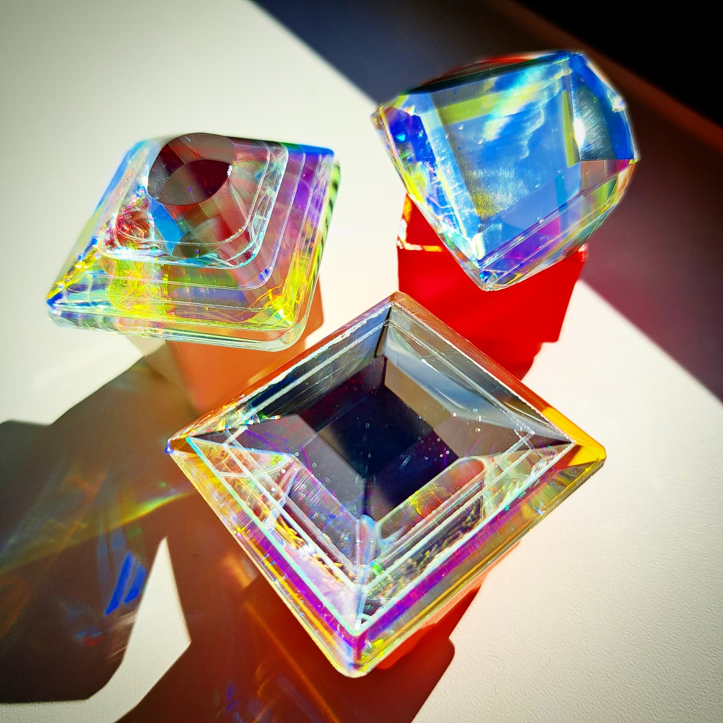 I choose borosilicate dichroic glass and optical glass for its exceptional clarity, durability, and resistance to thermal shock, qualities that ensure each creation retains its beauty for generations. Through the meticulous art of coldworking—a technique where the glass is carefully shaped, ground, polished, and refined without heat—I bring out the inherent brilliance and intricate textures of this extraordinary material.