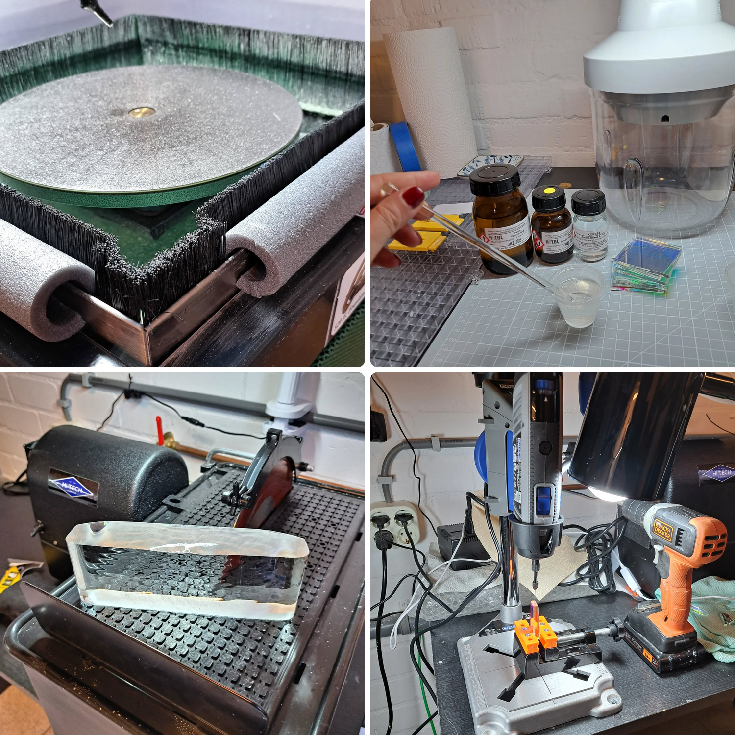 I taught myself the art of glassworking through countless hours of research, online tutorials, and hands-on practice. The intricate and captivating world of glass coldworking—shaping, refining, and polishing glass without heat—has become my creative haven.