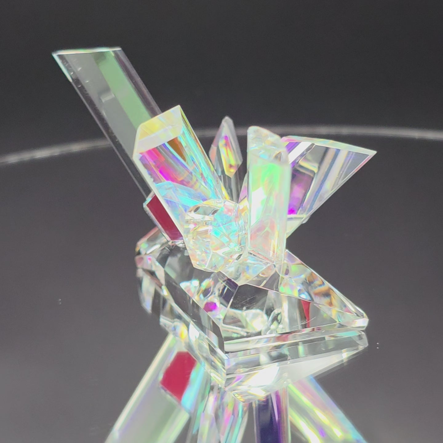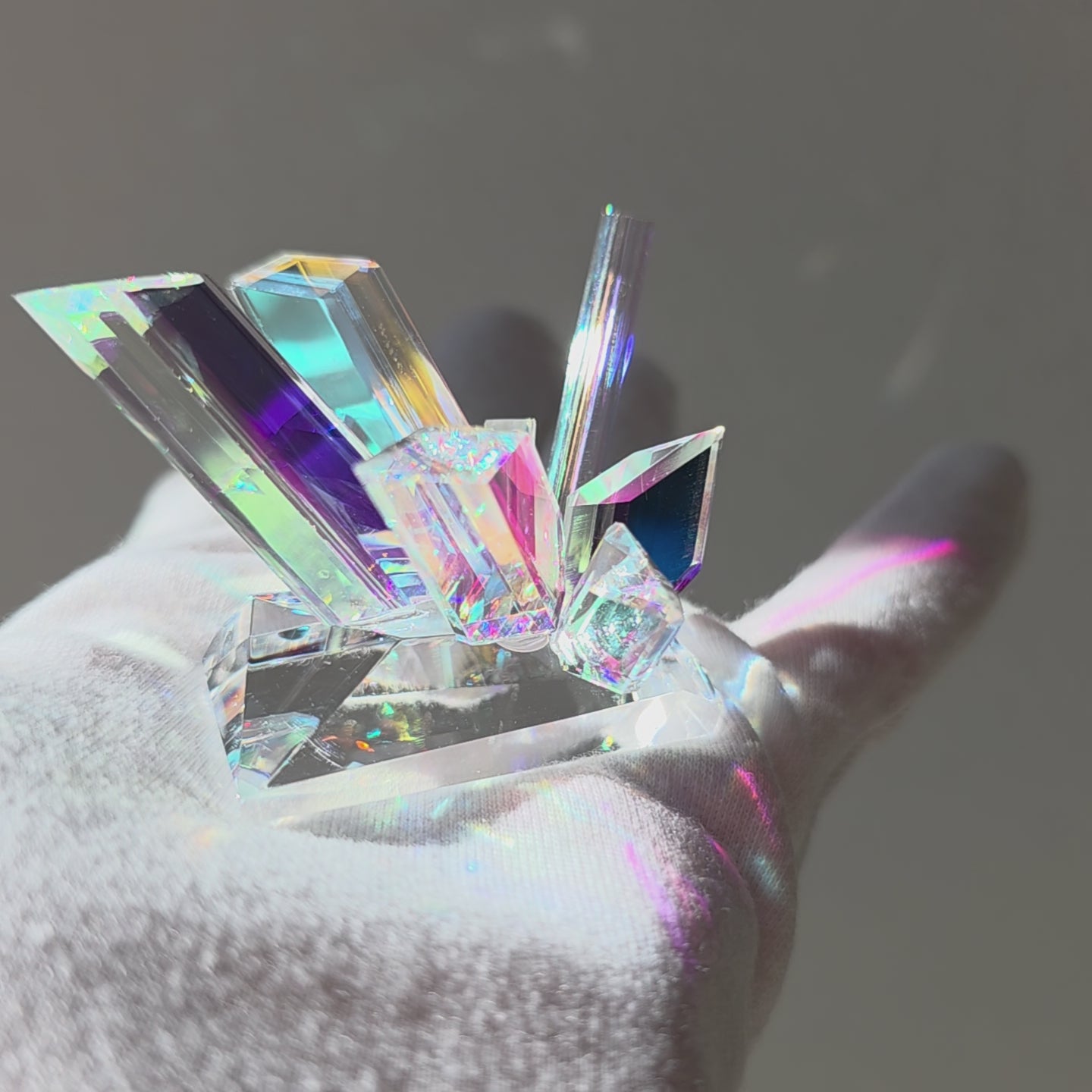 Paz – meaning refined gold, symbolizing purity, rarity, and timeless value. Paz is a radiant composition of crystalline shards, rising from a faceted base like light captured in solid form. Crafted from optical glass with embedded dichroic elements, it creates an explosion of shifting color—violets, aquas, magentas, and golds—that change with every angle of view. Compact yet striking, Paz embodies both delicacy and brilliance, making it a luminous presence in any collection.
