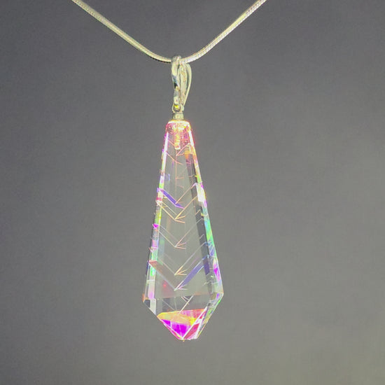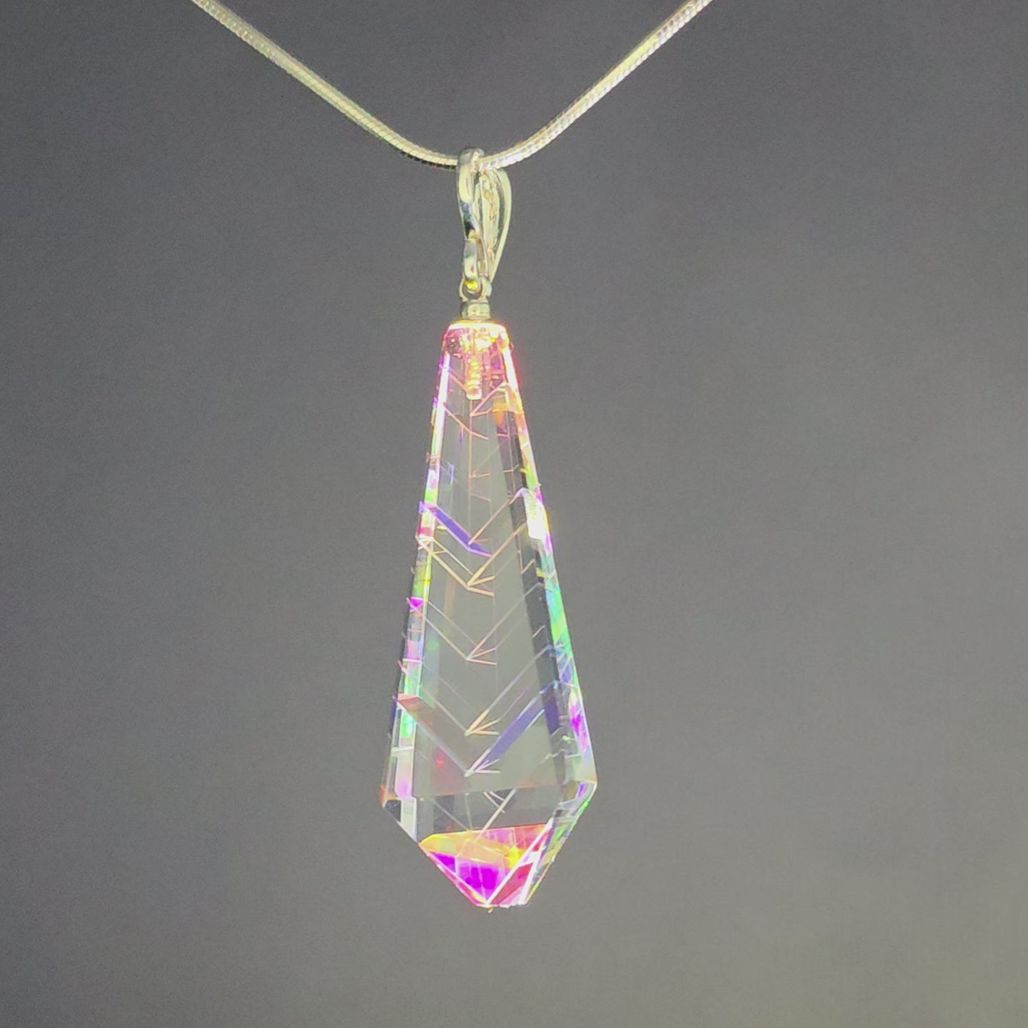 As it moves, the pendant reveals layered hues of cyan, magenta, green, and gold, suspended in a dance of reflection and transparency. Sleek and architectural, Noy embodies clarity, sophistication, and modern artistry.