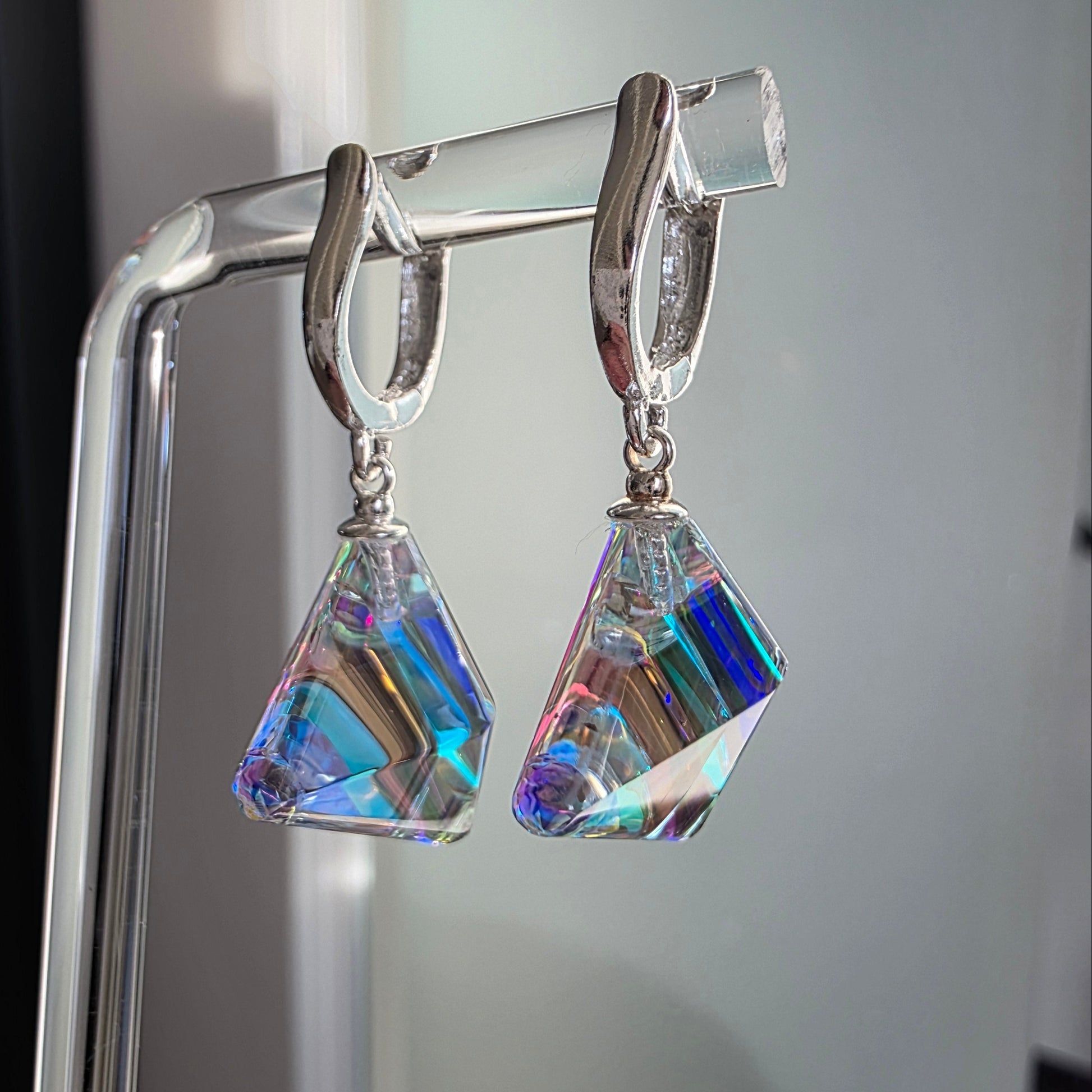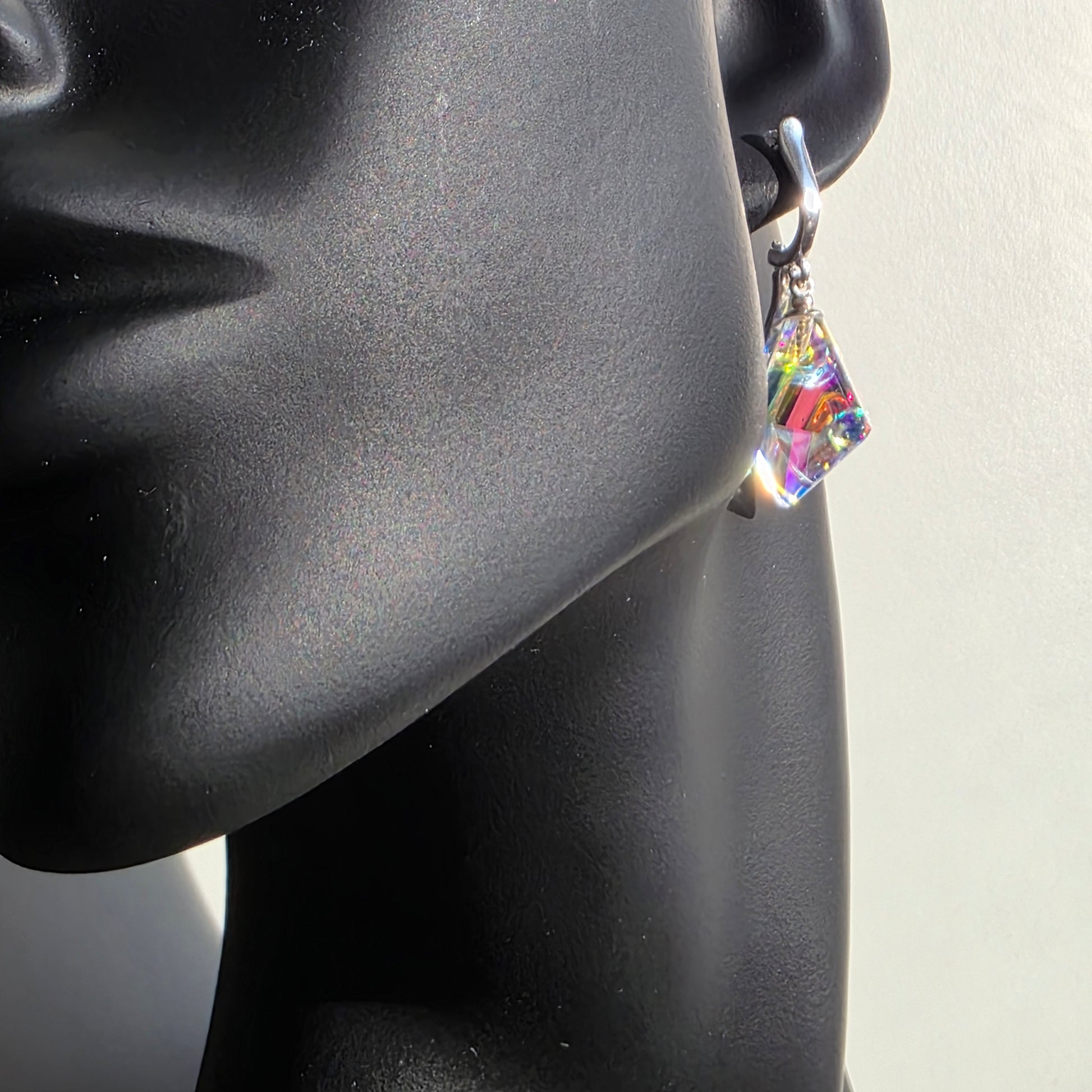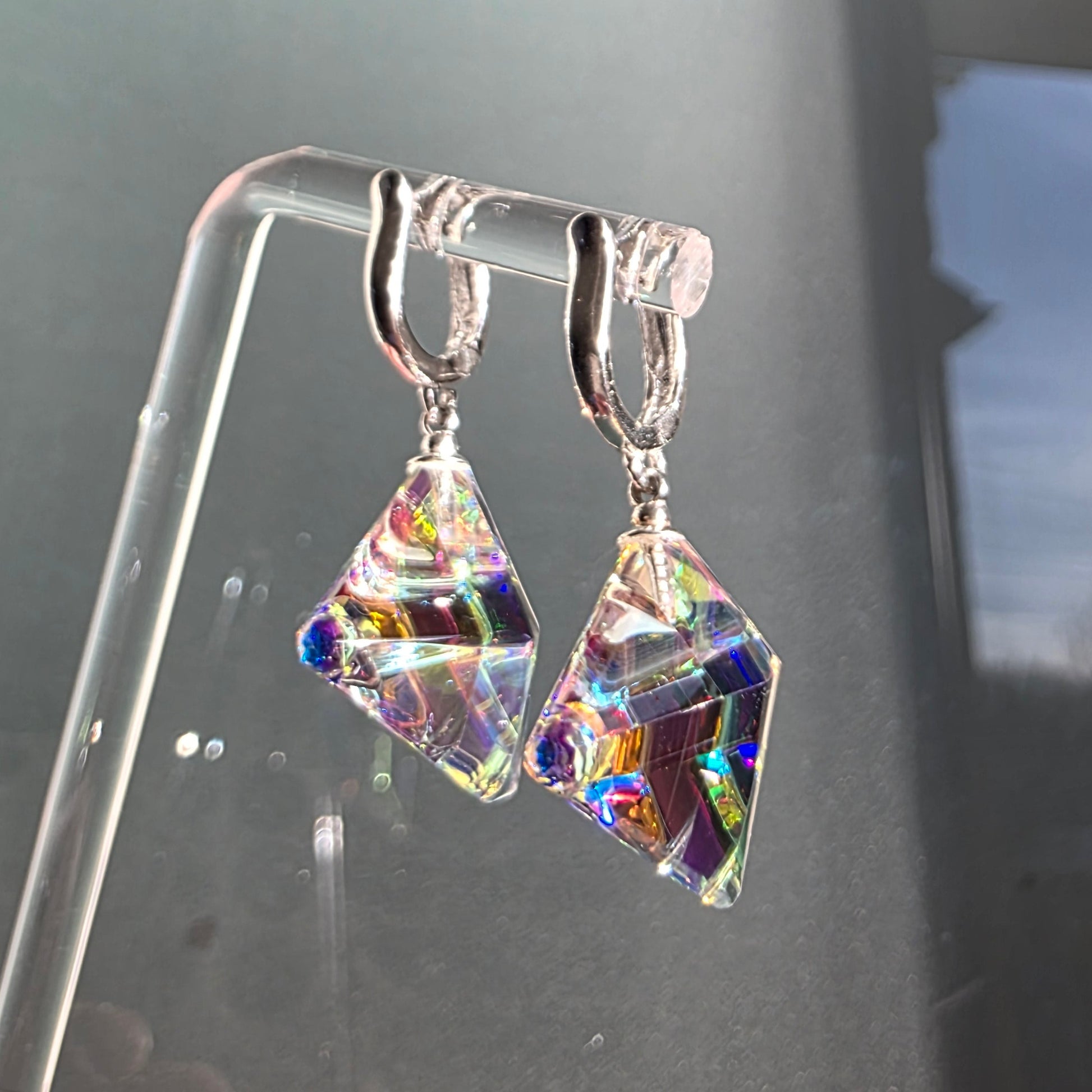 Each earring features an elegant, geometric sculpted form, alive with shifting color and delicate internal reflections. As they move, they cast glimmers of violet, teal, rose, and gold—small prisms that transform light into something almost ethereal. Their compact, modern silhouette makes them striking yet effortlessly wearable.