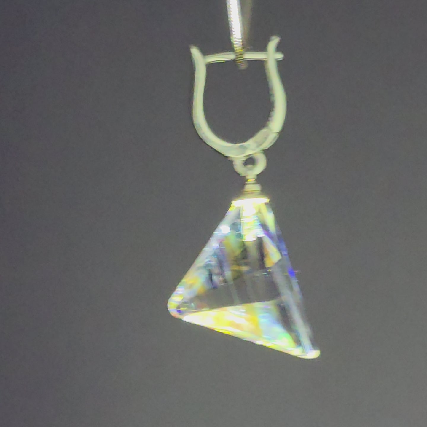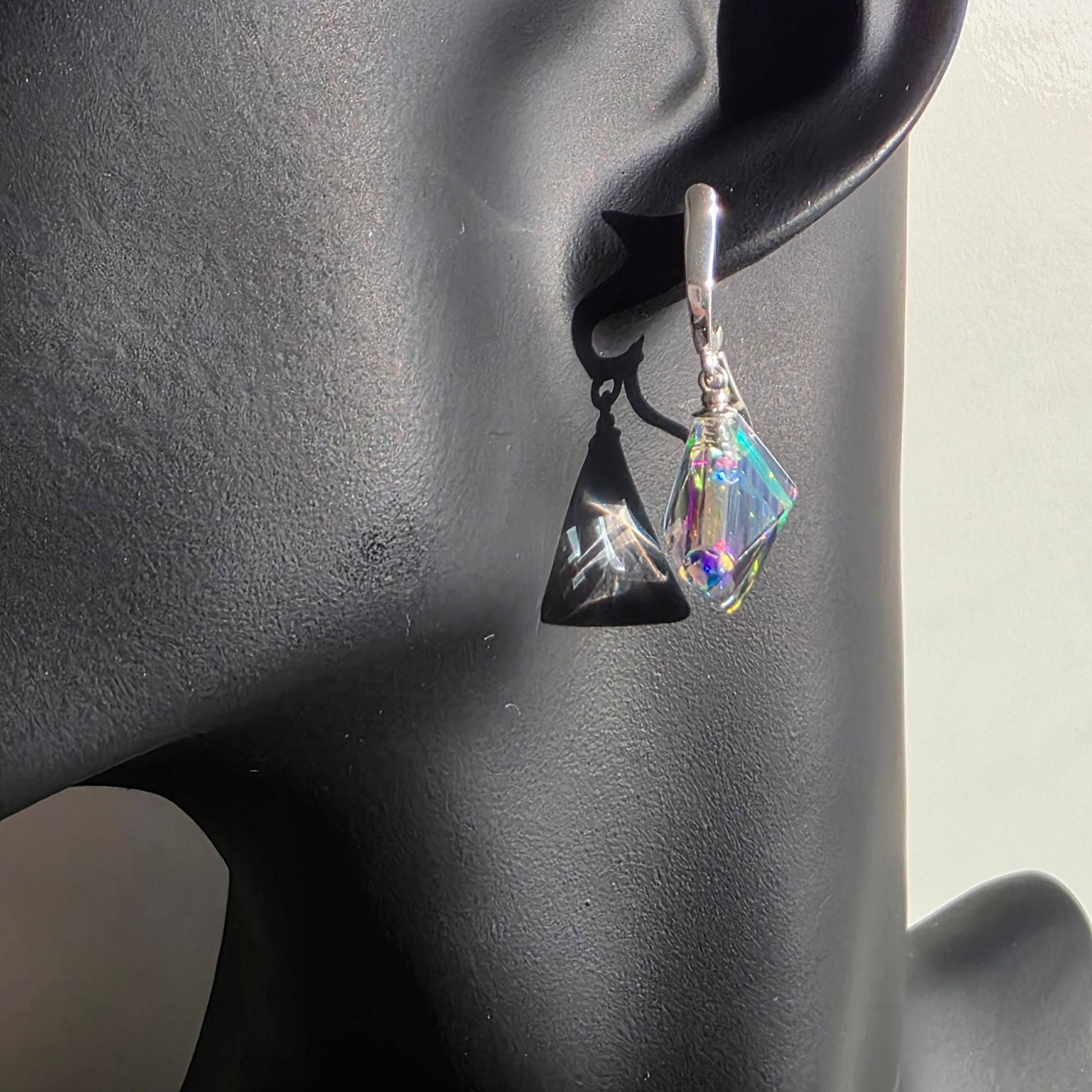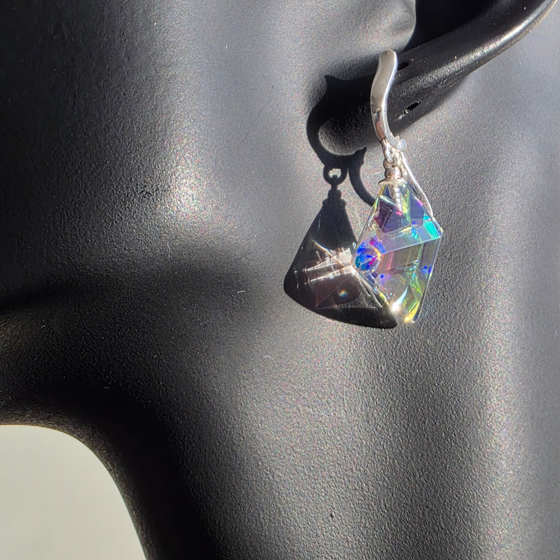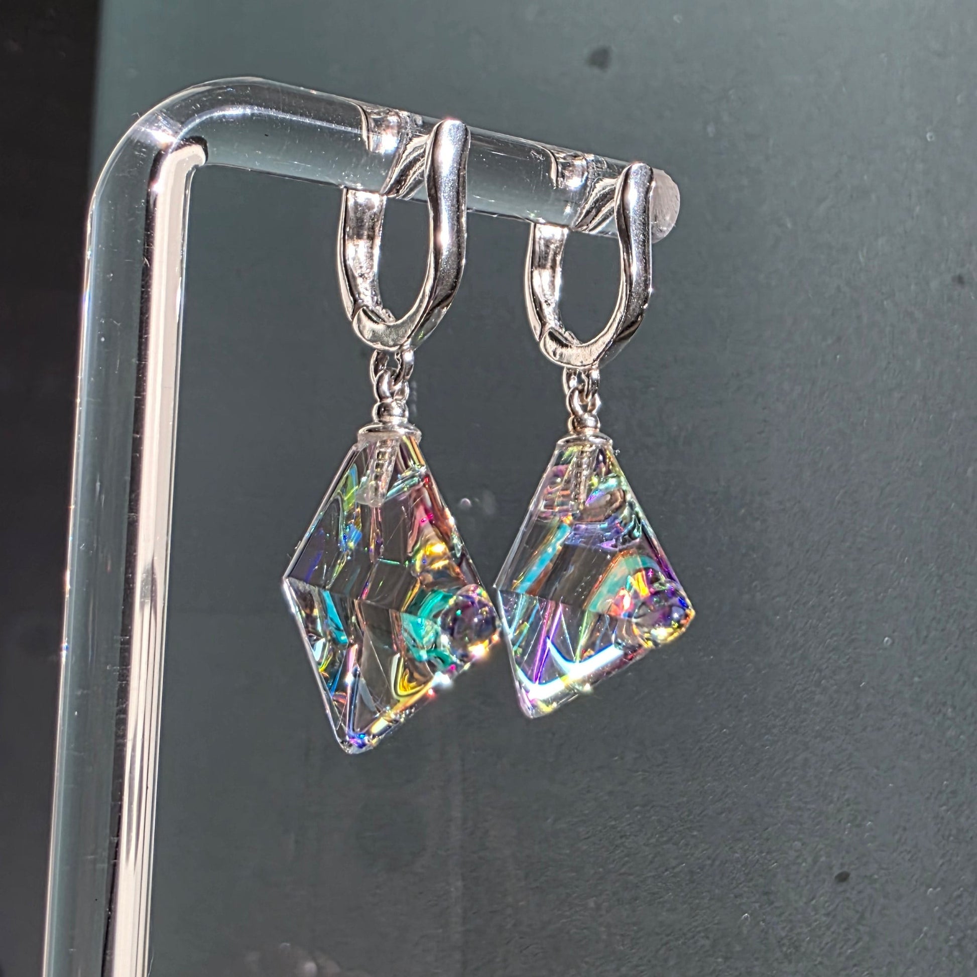 Each earring features an elegant, geometric sculpted form, alive with shifting color and delicate internal reflections. As they move, they cast glimmers of violet, teal, rose, and gold—small prisms that transform light into something almost ethereal. Their compact, modern silhouette makes them striking yet effortlessly wearable.