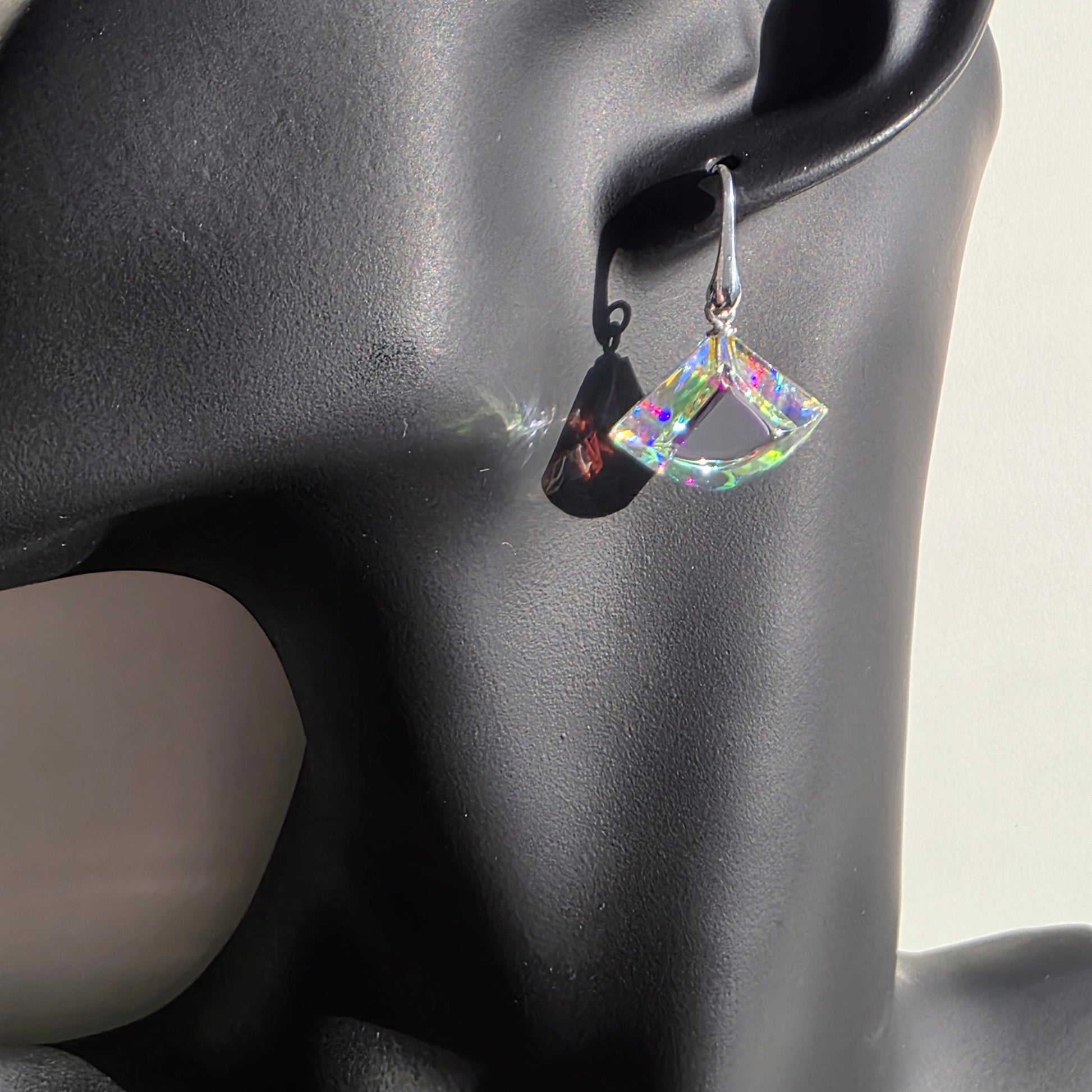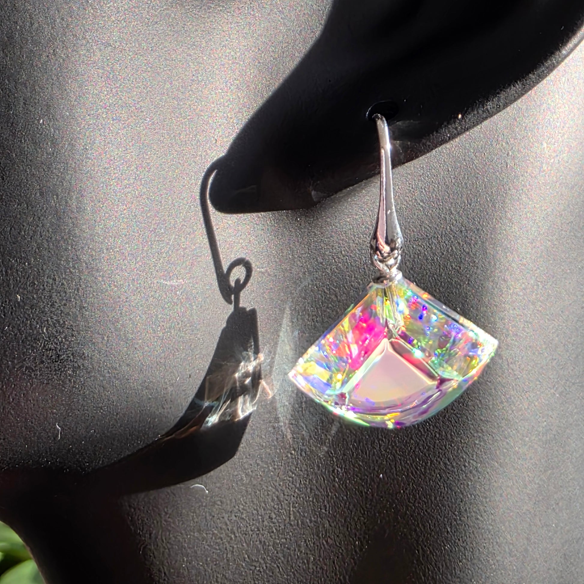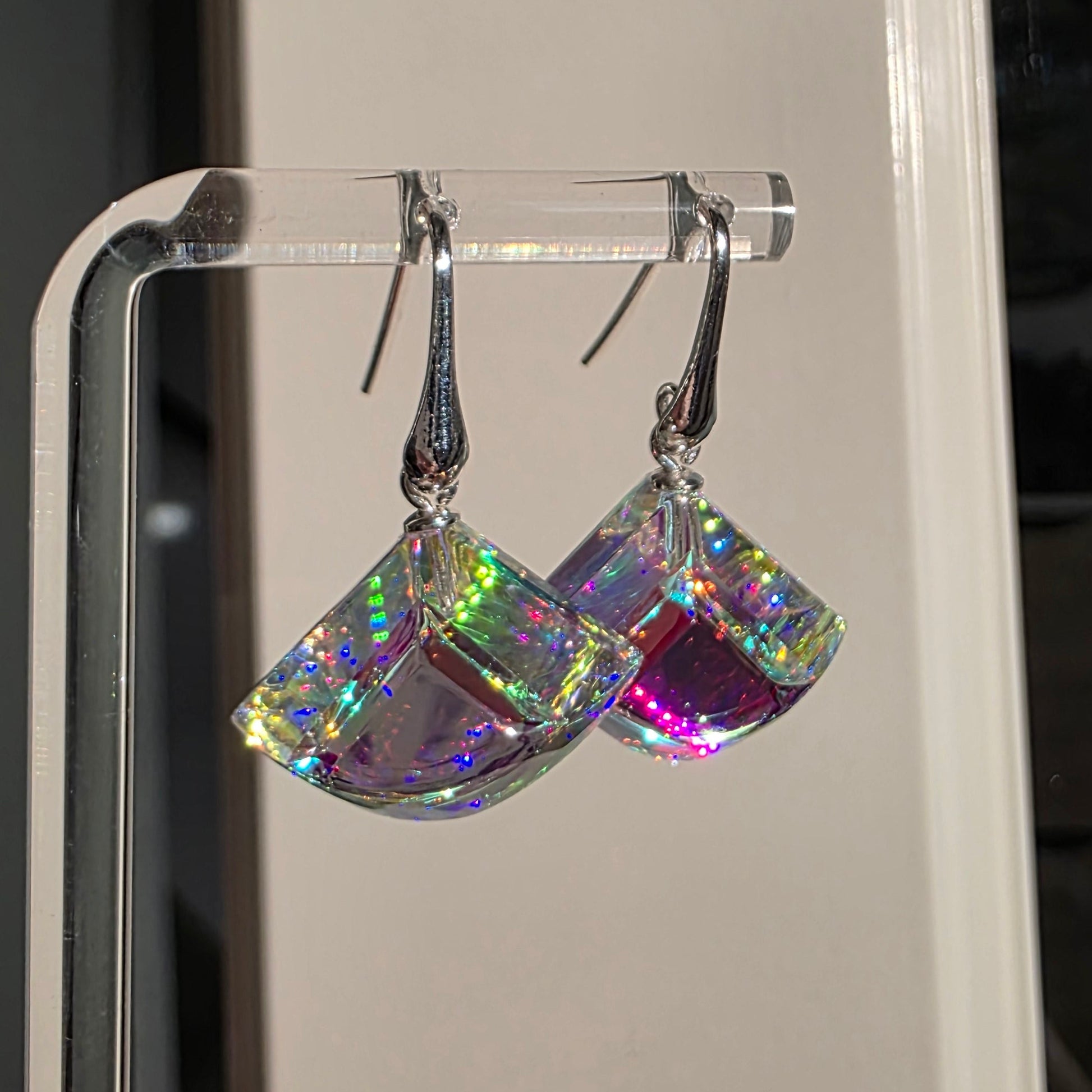 Keshet – meaning rainbow in Hebrew, a name that captures wonder, harmony, and the promise of light after rain. These earrings embody that spirit beautifully: a glimmering arc of color and radiance, sculpted from dichroic glass to reflect shifting hues with every movement.