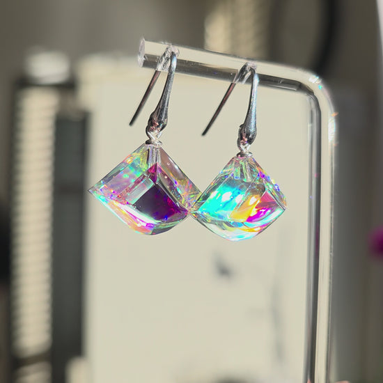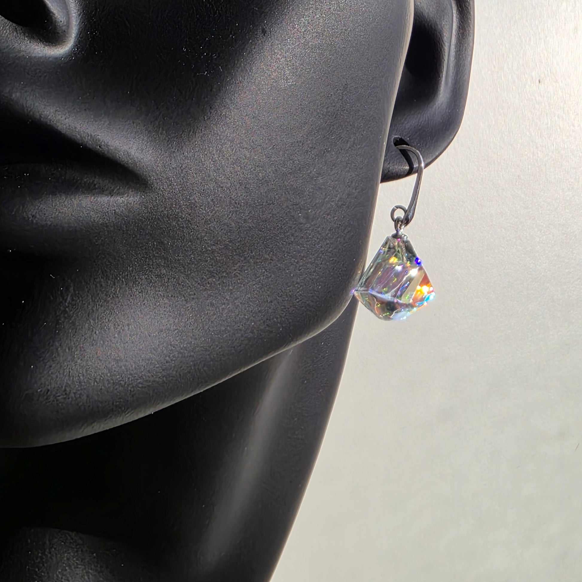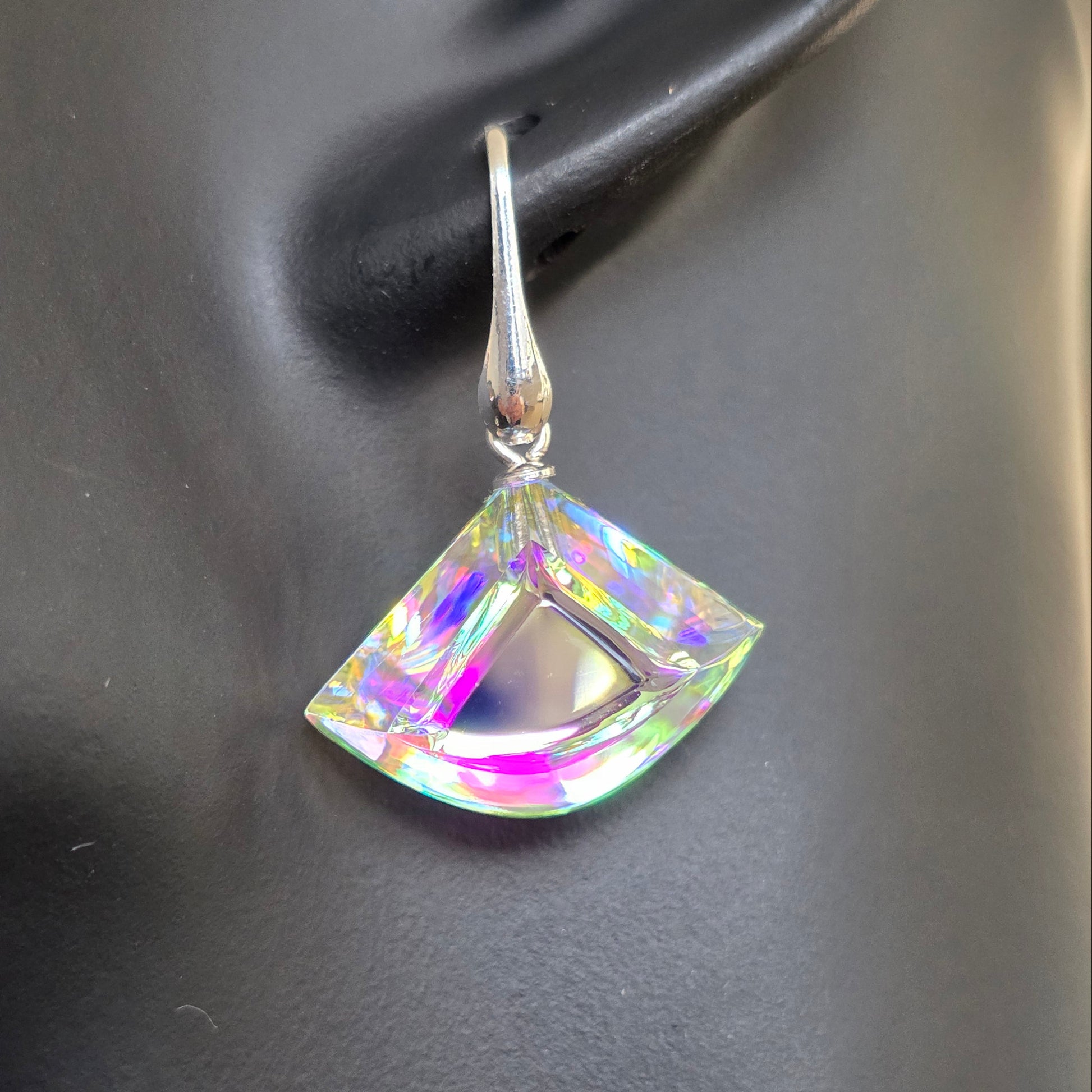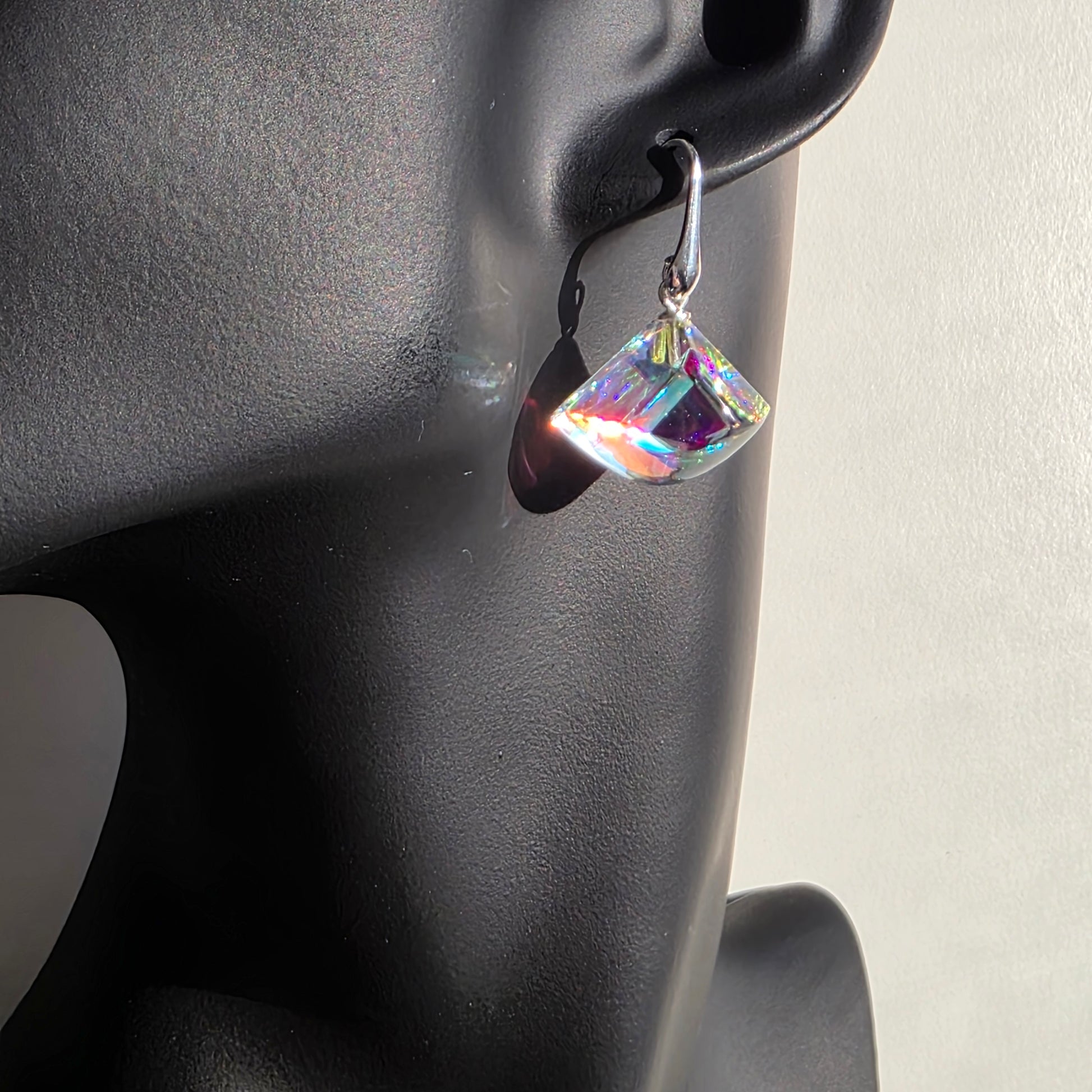 Keshet – meaning rainbow in Hebrew, a name that captures wonder, harmony, and the promise of light after rain. These earrings embody that spirit beautifully: a glimmering arc of color and radiance, sculpted from dichroic glass to reflect shifting hues with every movement.