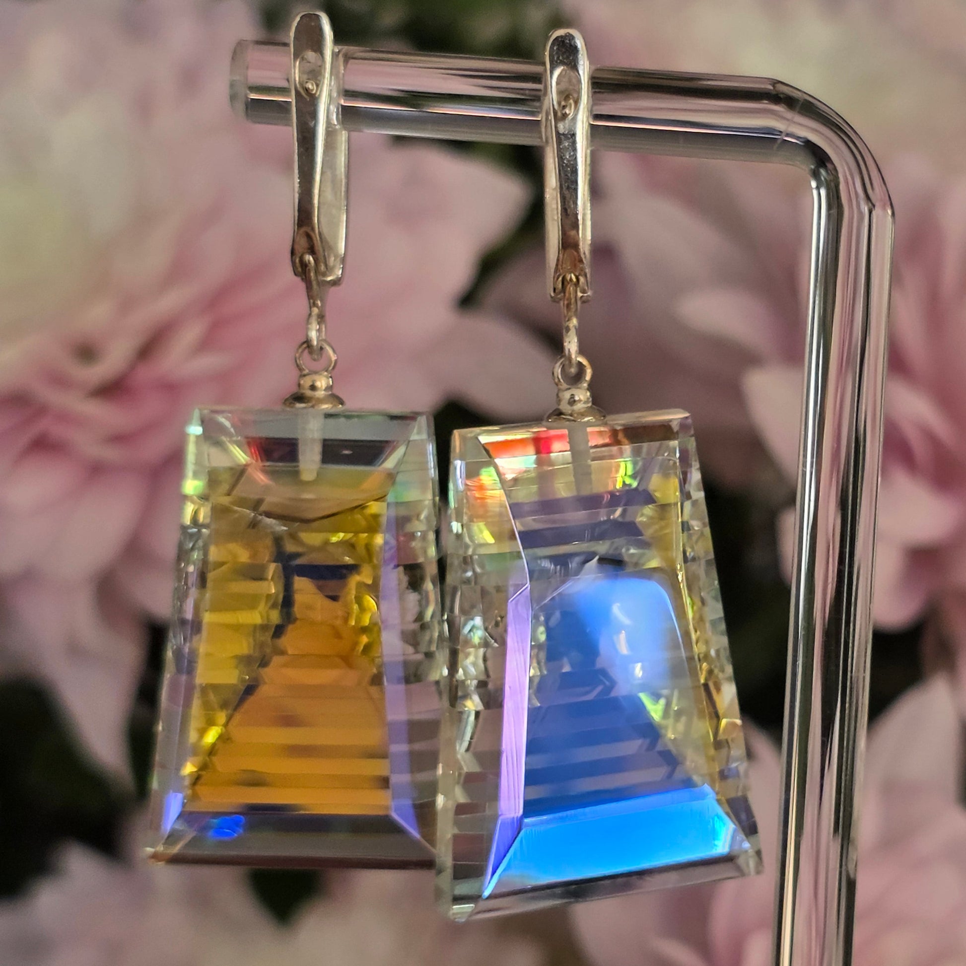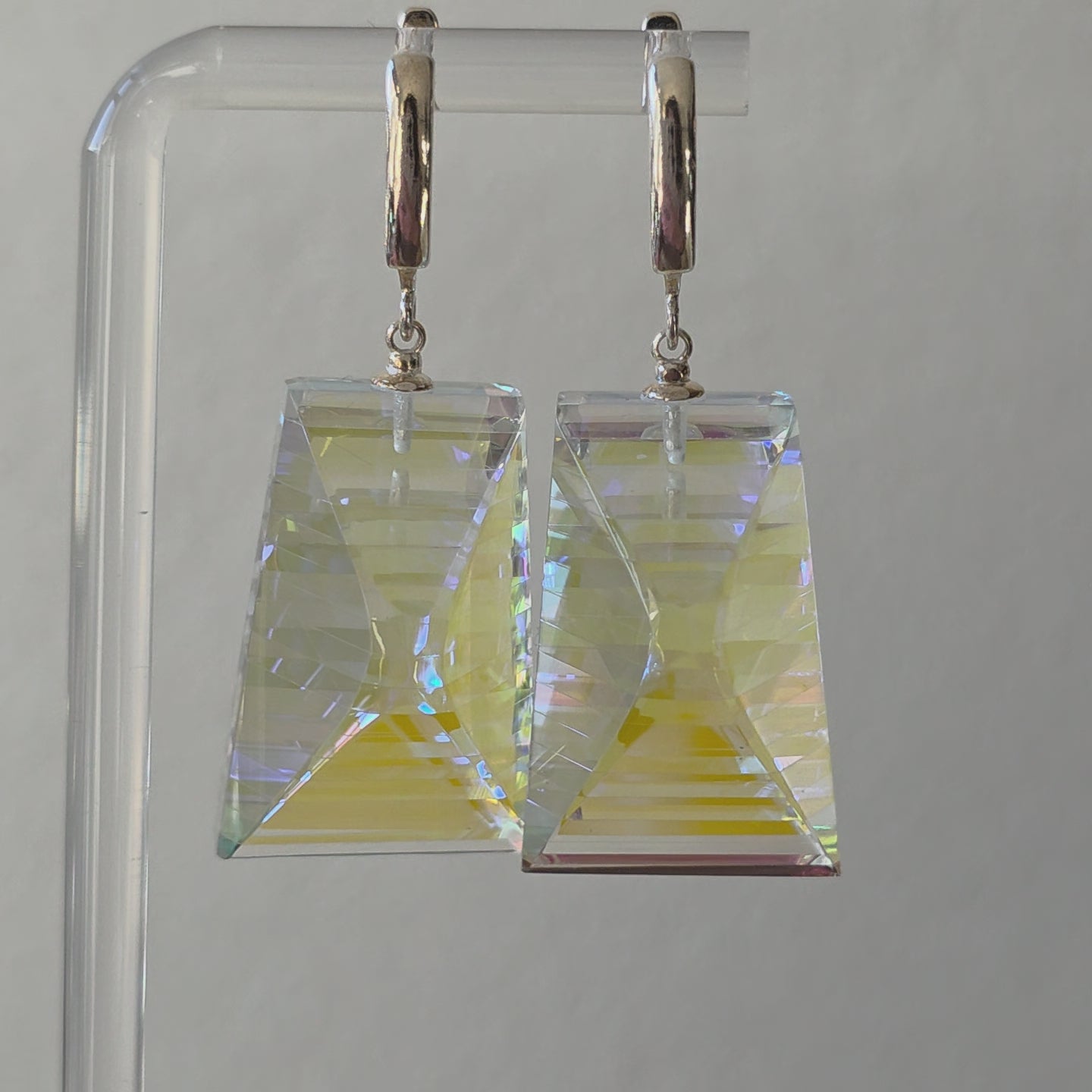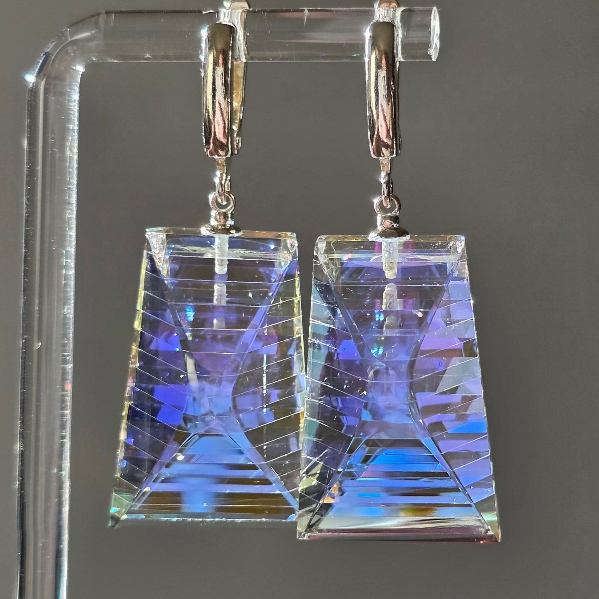 Moran is a radiant expression of light captured within structure. Handcrafted from dichroic and optical glass, these earrings reveal layered iridescence—soft blues, gold flashes, and prismatic reflections suspended within crystalline clarity. Their tapered architectural silhouette creates depth from every angle, transforming movement into a display of shifting brilliance.