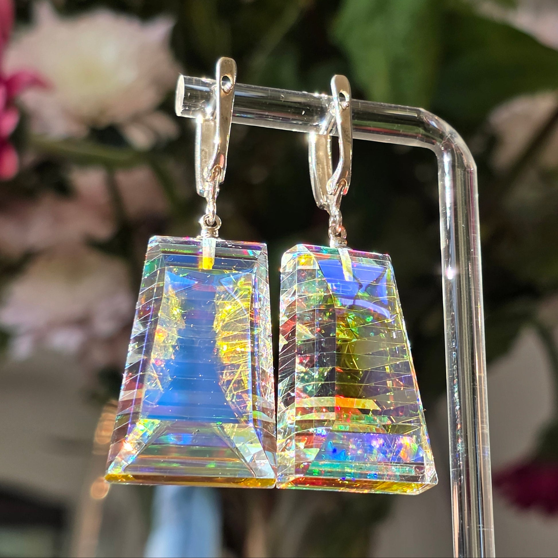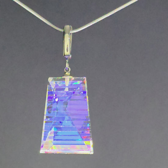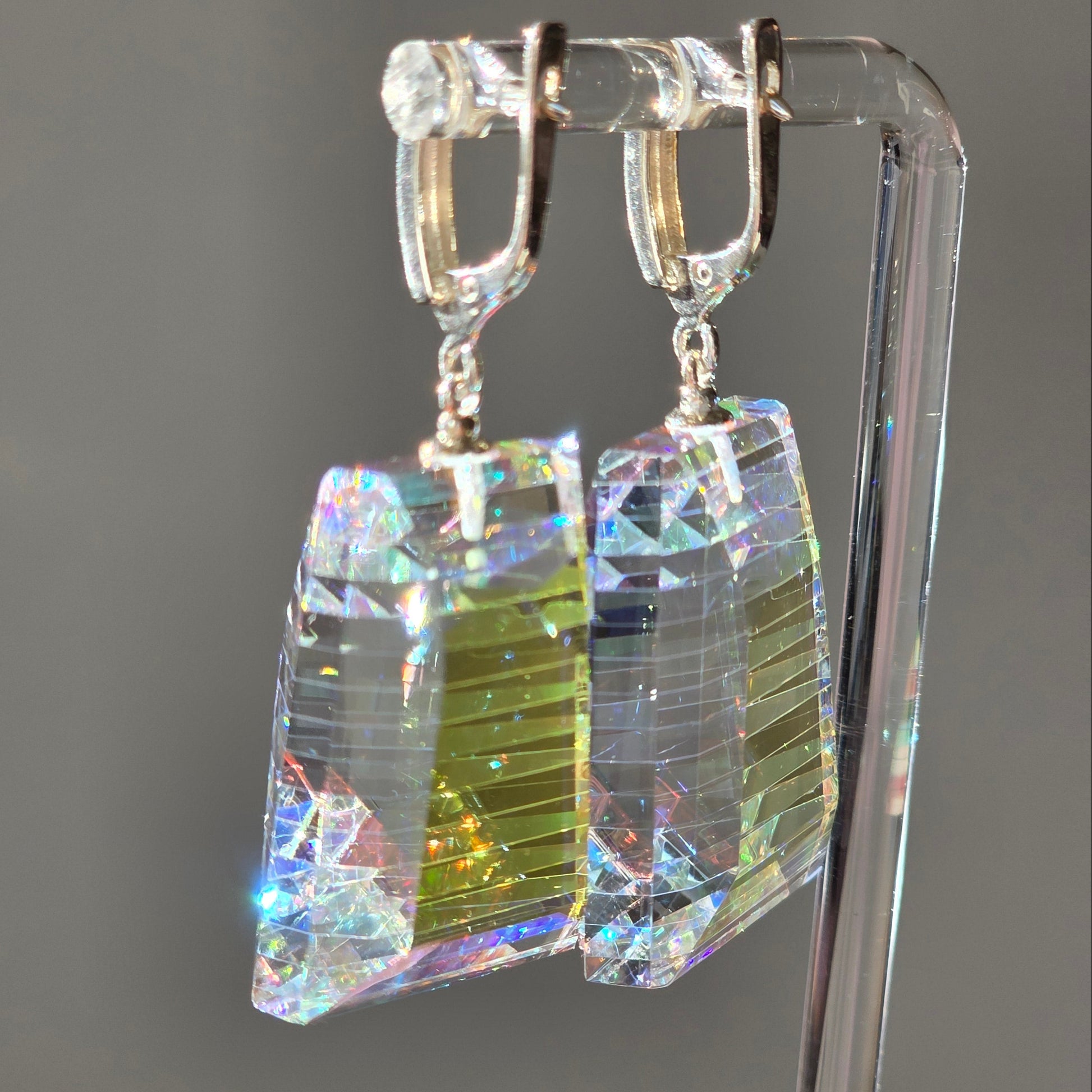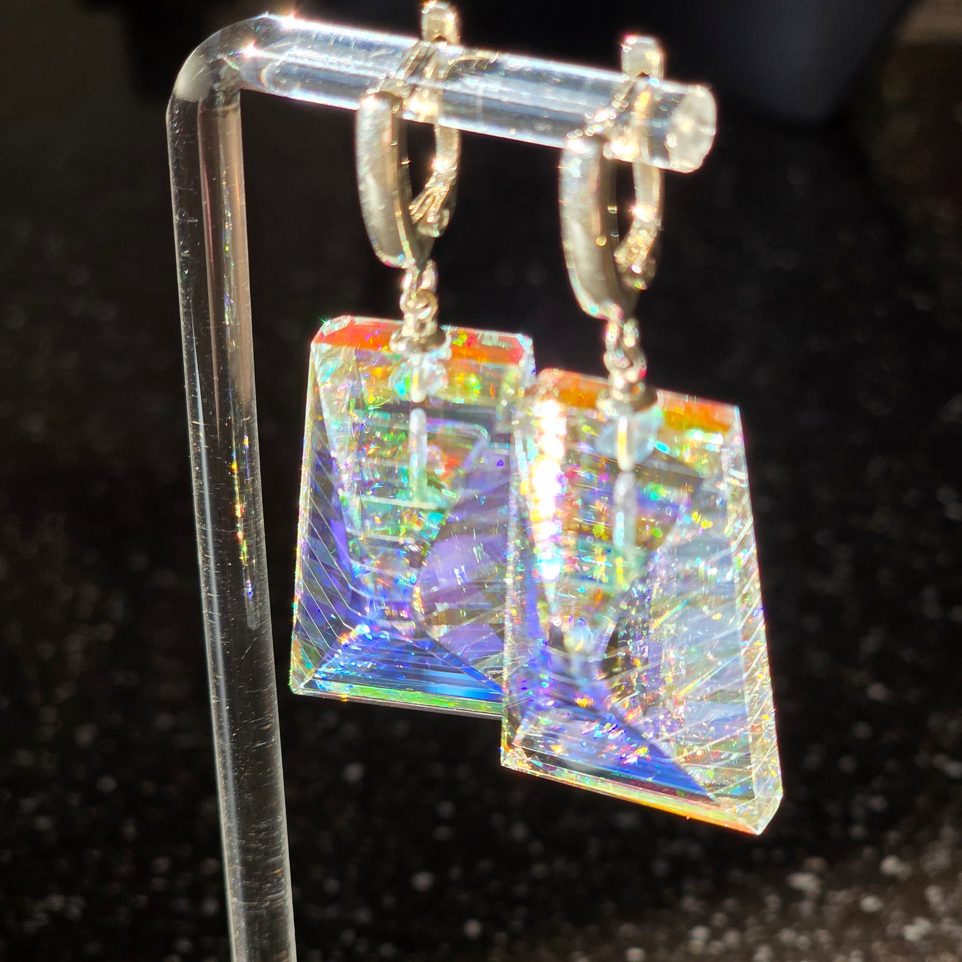 Moran is a radiant expression of light captured within structure. Handcrafted from dichroic and optical glass, these earrings reveal layered iridescence—soft blues, gold flashes, and prismatic reflections suspended within crystalline clarity. Their tapered architectural silhouette creates depth from every angle, transforming movement into a display of shifting brilliance.