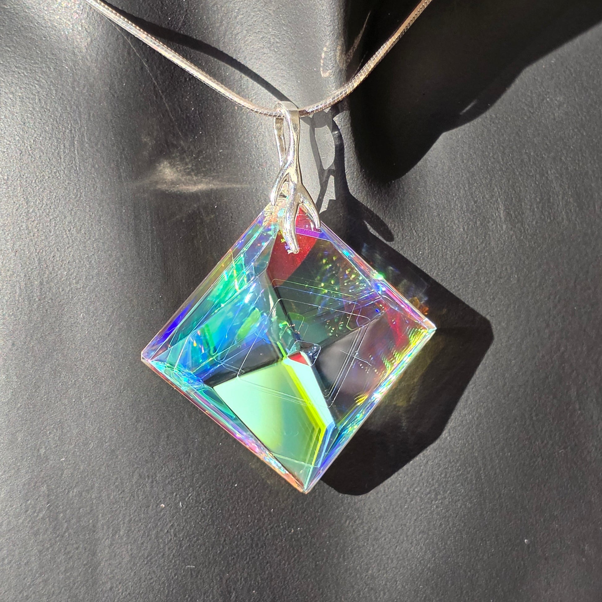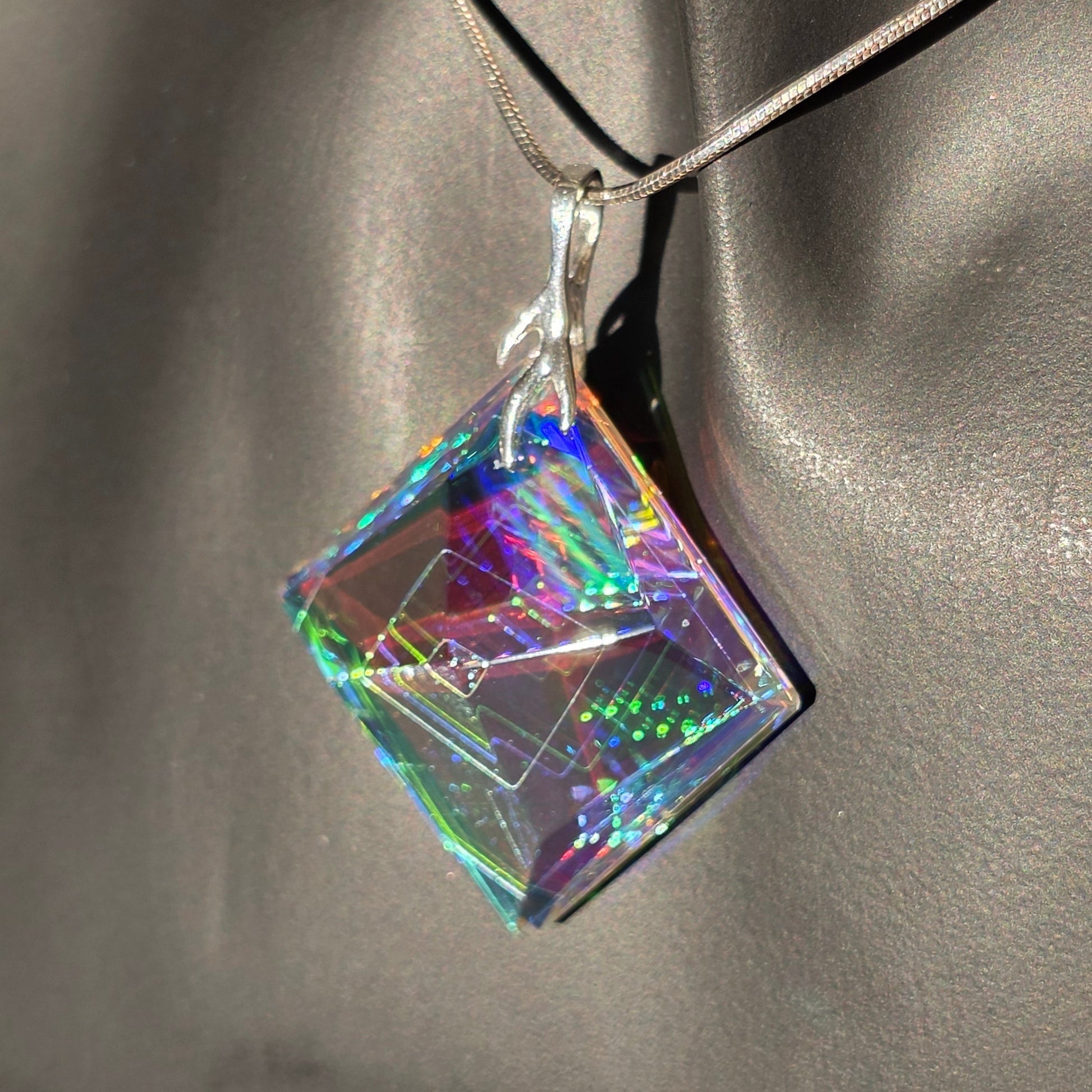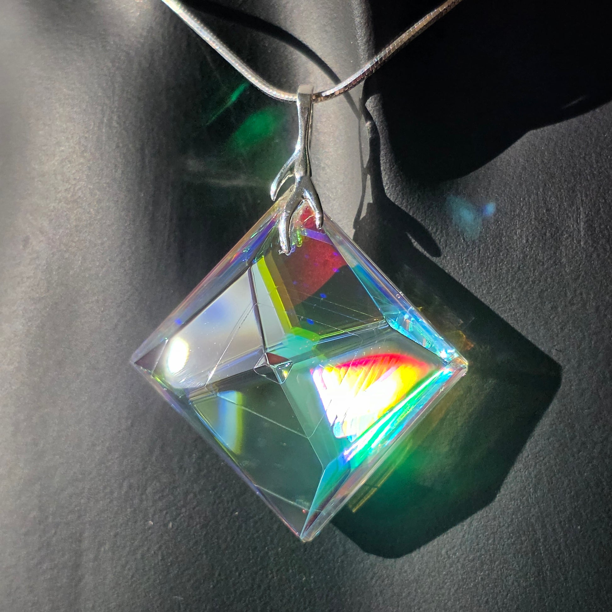 Neta is a meticulously handcrafted pendant sculpted from dichroic and optical glass. Its geometric, faceted silhouette forms a luminous prism, capturing and refracting light into shifting veils of emerald, sapphire, rose, and gold. At its center, a subtle internal pyramid creates depth and architectural intrigue, as if light itself has taken root within the glass.
